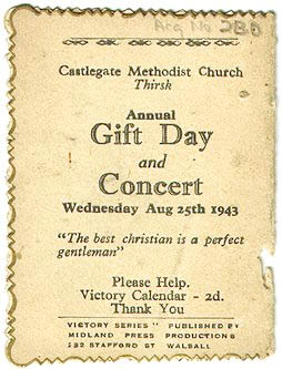 This little calendar, ideal for a wallet or purse, was sold by Castlegate Methodist Church in Thirsk during its annual Gift Day and Concert in the summer of 1943. It cost two pence (roughly 1p in decimal currency). Despite the name and the letter V on the front, it was to be another year and nine months before the war in Europe came to an end.